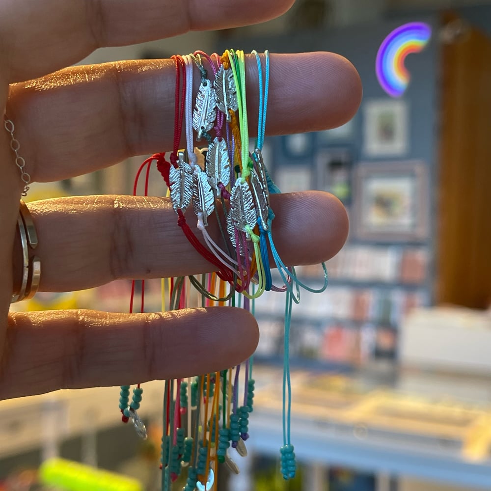 this bracelet is made with double thread, seed beads, sterling silver feather charm and a macrame closure to adjust any size.