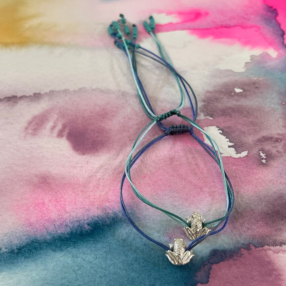 We make this bracelet with double thread, seed beads, sterling silver frog charm and a macrame closure to adjust any size.